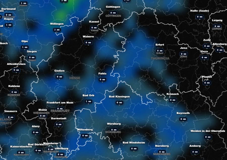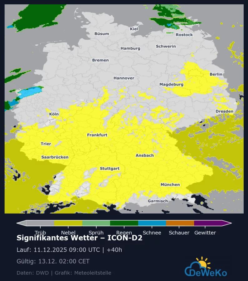 In der Nacht zum Montag im Süden und in Teilen der Mitte, vor allem im Thüringer Becken, erneut Nebel mit Sichtweiten unter 150 m.